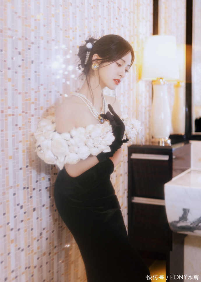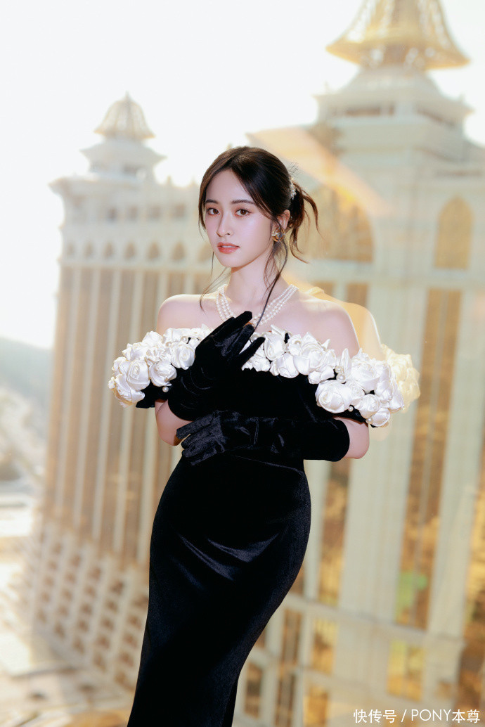 最吸睛的莫过于肩颈与袖口的立体白玫瑰装饰—— 缎面材质的花瓣饱满立体,包裹着细碎的珍珠,采用非遗刺绣工艺手工缝制,历经 200 小时匠心打造,每一片花瓣都栩栩如生,沿着一字肩边缘舒展绽放,为深沉的黑色注入了温柔浪漫的气息,形成强烈的视觉对比,让造型瞬间跳出单调,变得灵动鲜活。珍珠的点缀则增添了贵气感,与丝绒材质碰撞出精致火花,细节处尽显高级。